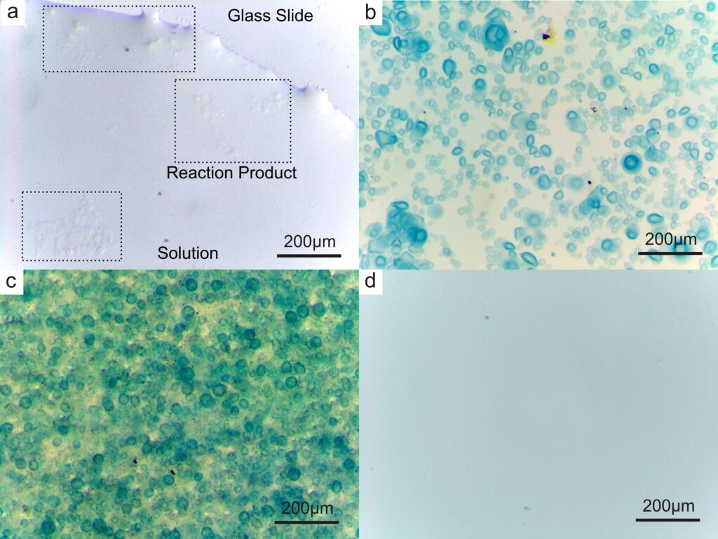 Then, we tried to introduce the reaction of iron ions into the formation of calcium alginate reaction vessel to verify that the calcium alginate generated in situ can serve as the reaction vessel. When sodium ferrocyanate solution is mixed with ferric chloride solution, the mixed solution will change from light yellow to blue. We added sodium ferrocyanate solution to sodium alginate solution so that the resulting droplets were a mixture of sodium alginate and sodium ferrocyanate, and a mixture of calcium chloride and ferric chloride was added to the petri dish. At the end of the reaction, the blue droplets can be clearly observed under the light microscope at 5.6 times magnification. This means that the reaction can be carried out in calcium alginate reaction vessels.