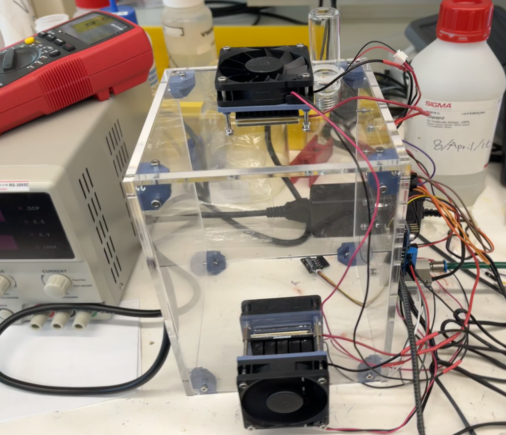 Our brilliant intern Basia Jarzabek had just finished the 3rd year of her undergraduate course in Chemistry but this summer her days were mostly spent 3D printing, laser cutting, soldering and programming. She went from never having touched CAD software to helping everyone with their parts. Aerosols particles are very sensitive to their environment, so Basia’s goal was to prototype a temperature- and humidity-controlled environment for them.